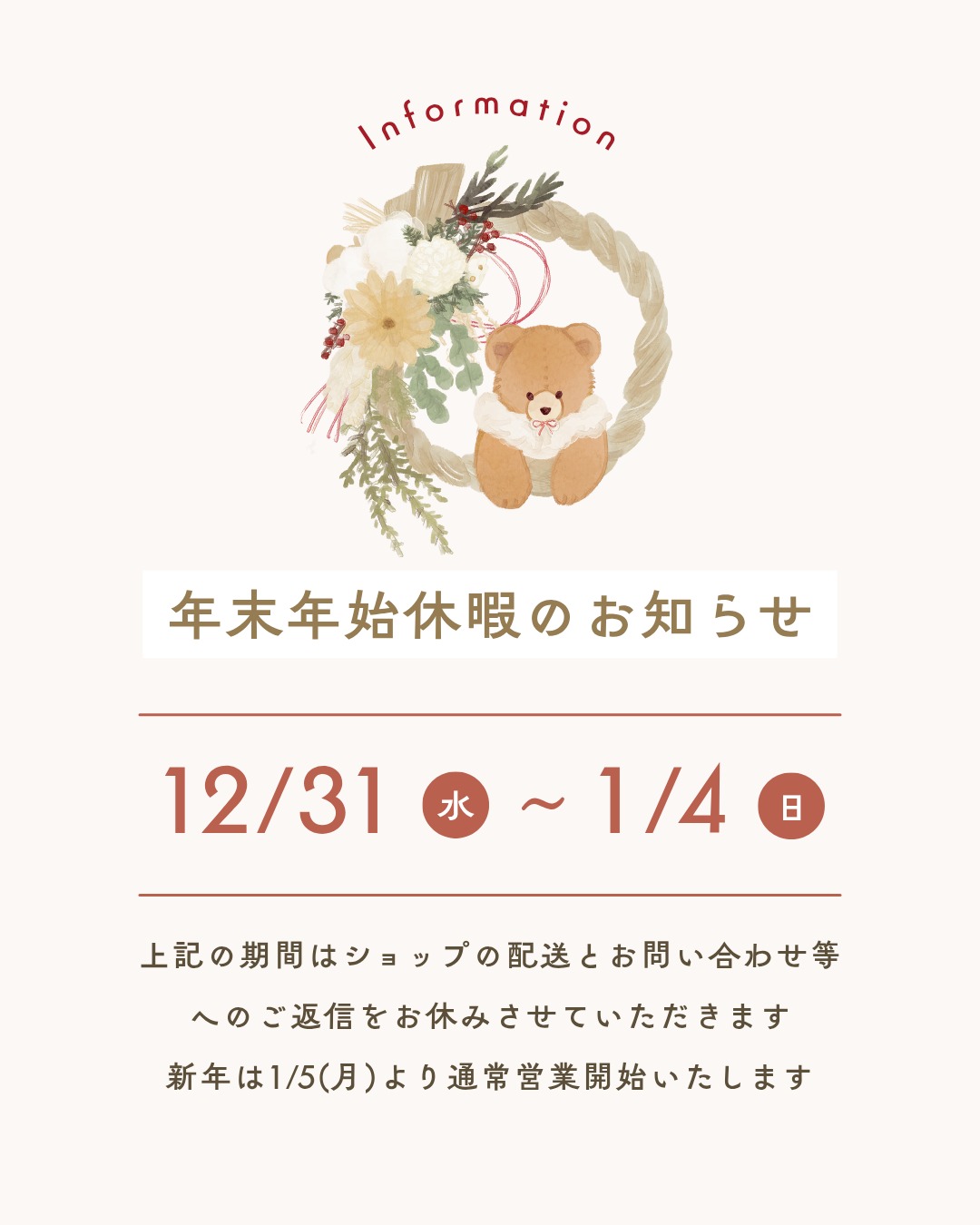 12/31(水)~1/4(日)】 の期間オンラインショップの休暇 を取らせていただきます。